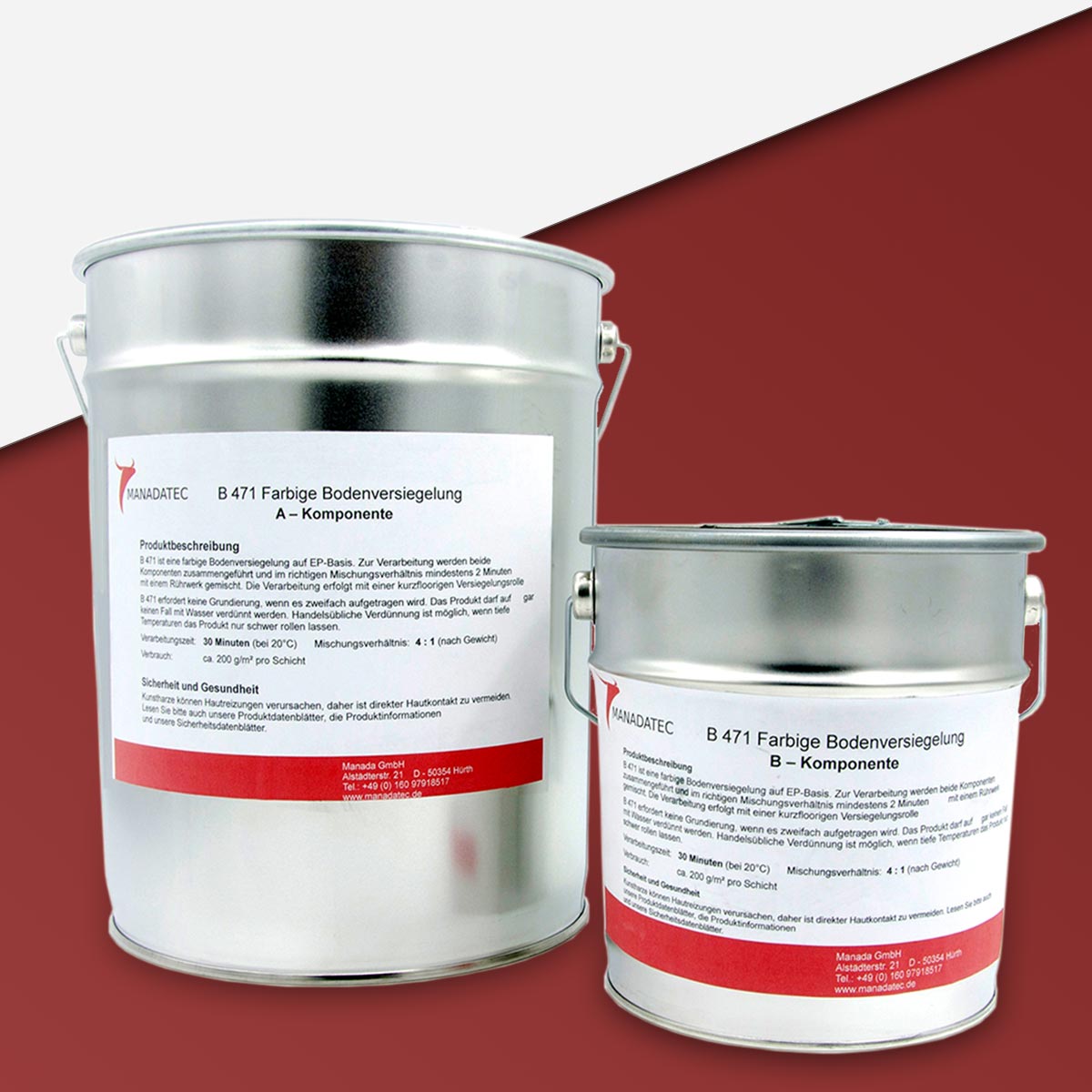 • 2K Epoxidharz Bodenbeschichtung Manadur B 471 in RAL 3011 Schweden-Rot. Farbige 2-Komponenten Epoxidharz Bodenbeschichtung Roll-Bodenbeschichtung (zum Aufrollen).