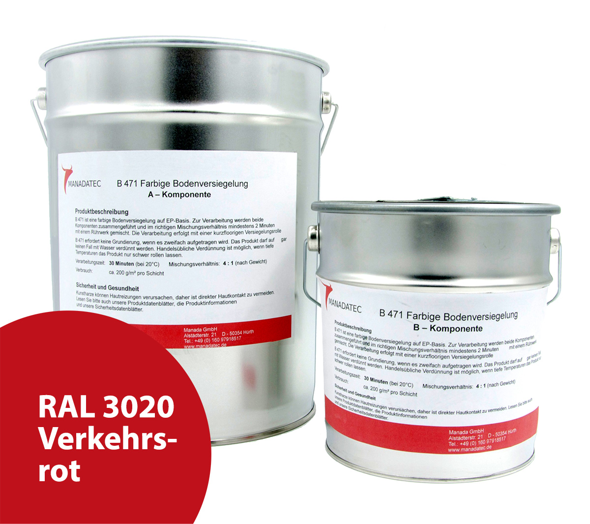 • 2K Epoxidharz Bodenbeschichtung Manadur B 471 in RAL 3020 Verkehrsrot. Farbige 2-Komponenten Epoxidharz Bodenbeschichtung Roll-Bodenbeschichtung (zum Aufrollen).