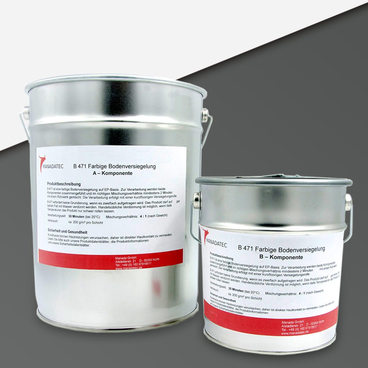 • 2K Epoxidharz Bodenbeschichtung Manadur B 471 in RAL 7043 Verkehrsgrau. Farbige 2-Komponenten Epoxidharz Bodenbeschichtung Roll-Bodenbeschichtung (zum Aufrollen).